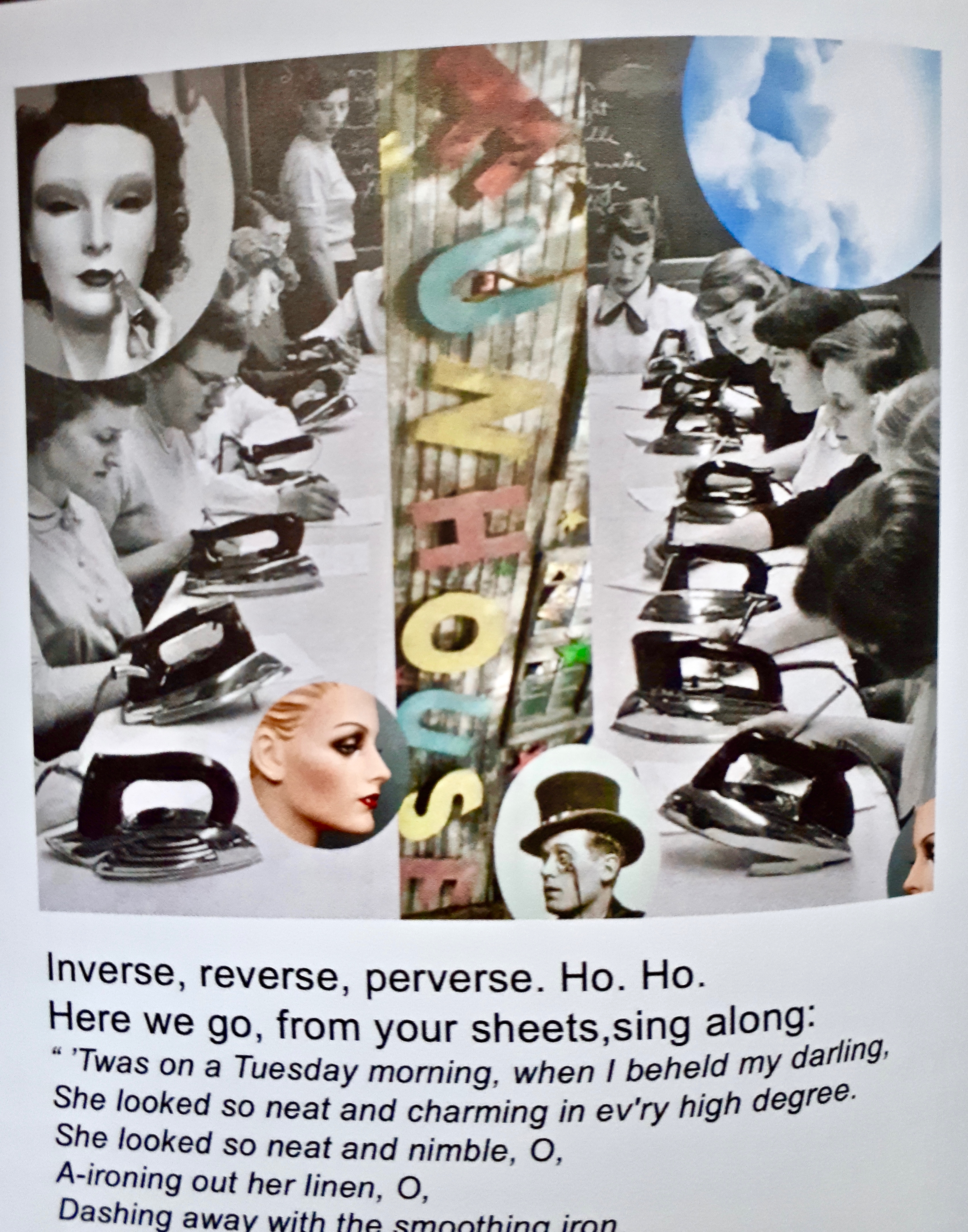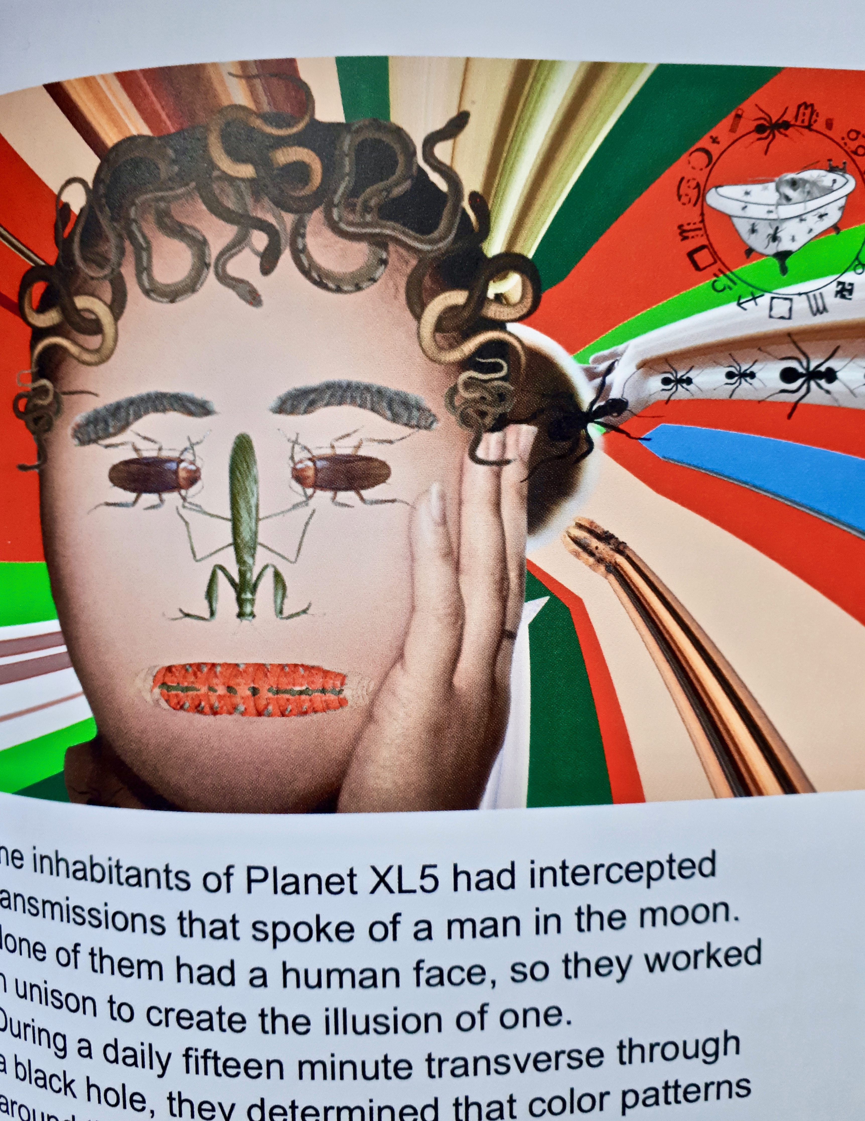 “Inverse, reverse, perverse. Ho. Ho”, begins one paragraph. If James Joyce, William Burroughs and Kurt Schwitters gene spliced a baby then this would be the fully-grown teen, rambunctious and articulate, conversing with élan and much conversational charm. “The inhabitants of Planet XL5 had intercepted transmissions that spoke of a man in the moon. None of them had a human face, so they worked in unison to create the illusion of one.” begins another paragraph, a lovely pastiche gumbo of Gerry Anderson’s oeuvre and Georges Méliès A Trip to the Moon (Le Voyage dans la Lune 1902) while schmoozing casually with a Zen master holding a cocktail.