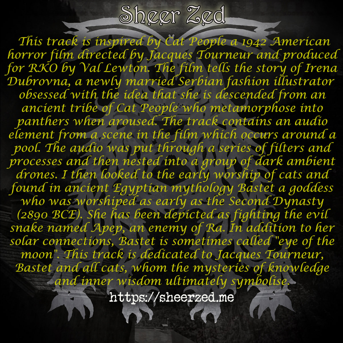 My contribution to Sombre Soniks Dark Ambient vol. 21 compilation which includes 23 sublime compositions around the theme of pre-1950’s horror films is the track Cat People.