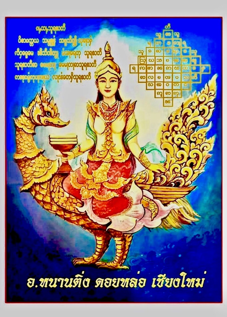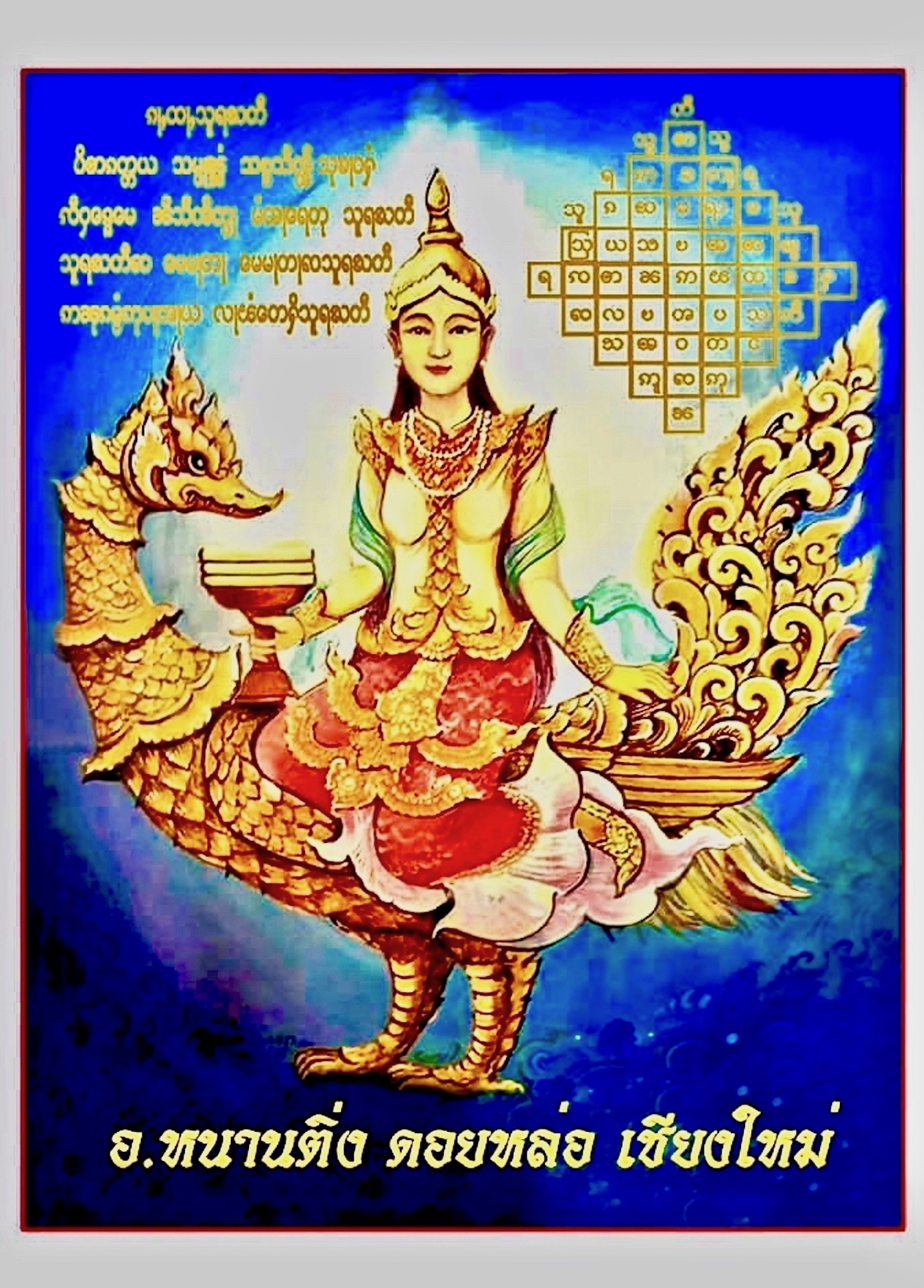 I received my very first Sak Yant from Ajarn Nanting in September 2017. Sak Yant is a tattoo of profound magical power and can only be applied by a fully realized and recognized master of the art. The Thai word “Sak” means “to tap”, while the word Yant, derived from the Sanskrit word Yantra, means literally “machine” or “contraption”, a divine mystical diagram rich with occult meanings. Sak Yant uses sacred ancient Khmer or Khom alphabet to write Buddhist Sutras and other sublime hybrid spells using the Pali Sanskrit alphabet. Ajarn Nanting has had 28 masters pass on their profound magickal knowledge to him. Using the traditional Sak Yant rod, Ajarn Nanting applied an invisible tattoo made up of secret herbs and oils to my upper back dedicated to the magnificent Thai and Burmese deity Mae Surasatee, the deva that rides a swan. She is the deity in charge of and guardian of the Tripiṭaka, meaning “Triple Basket” the traditional term for ancient collections of Buddhist scriptures, universal knowledge, infinite wisdom, good luck, and music. Mae Surasatee is the direct descendant of the Hindu goddess Saraswati who is the Hindu goddess of knowledge, music, art, speech, wisdom, and learning. She is a part of the trinity (Tridevi) of Saraswati, Lakshmi, and Parvati. Saraswati translates from Sanskrit literally as “she who has ponds, lakes, and pooling water” or occasionally “she who possesses speech”. Ajarn Nanting has built over time a remarkable shrine specifically to Mae Surasatee from which he performs daily rituals for all that wish to have blessings dedicated to this deity. In January 2020 Ajarn Nanting gave me two permanent Mae Surasatee Sak Yants on my left and right shoulders in solid black ink. These two exactly similar ancient designs reflect numerous qualities that work together in tandem as a pair. The application of these two ancient Sak Yants in front of his shrine was then finished off with a blessing which took place underneath a sacred deep red cloth rich with diagrams, symbols and dedicate images dedicated to Mae Surasatee. Then a skull hat was placed on top of this cloth upon my head. It was a rather ornate and beautifully red initiation skull hat that resembled dragon’s scales. Red sequins and gold trimmed lining threaded this one of kind head wear. It had the vague look of a Tibetan Lama Buddhist head wear though much shorter and more highly decorated. During my January 2020 pilgrimage I was fixated, indeed somewhat possessed as if on a mission, that I needed to acquire a bucha (sacred statues with active magickal ingredients though this term does also initially mean ‘to praise or worship’) of Mae Surasatee. Peter Jenx, author and photographer of the Thai Occult book series and myself had planned to drive to Mae Sot, a city on the Thailand and Myanmar to acquire the said bucha and to visit some very old shops that might yield some hidden treasures. When it came to the punch I’d realised that I had depleted by budget and couldn’t go on this planned excursion. In a piece of serendipitous coincidence this idea became welcomingly redundant. While at Ajarn Nanting’s samnak (an Ajarn’s place of work, ritual, and a fully consecrated shrine) I saw that Ajarn had a small but extremely beautiful wooden and gold leaf covered bucha to Mae Surasatee underneath a glass case which was for sale alongside other incredible amulets, perfumes and a substance called See Pung, which is a form of enchanted magical beeswax. The bucha had been blessed many times by various Ajarns and venerated masters. Mae Surasatee’s countenance glowed like the sun. The golden swan upon which she rode and the exquisite motives across this highly magnetic artefact swallowed me whole. I asked how much this remarkable bucha was, placed the requested sum into a giving bowl and then worshipped at his shrine.