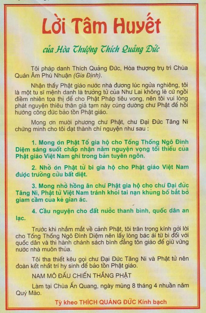“My dharma name is Thich Quang Duc, abbot of Quan The Am pagoda, Phu Nhuan, Gia Dinh. Realizing that Buddhism in our country is in a state of decline, I, a monk who is called the eldest son of Tathagata, cannot just sit there calmly and watch Buddhism perish. Therefore, I am happy to make a vow to burn this temporary body as an offering to the Buddhas to dedicate the merits to preserving Buddhism. I hope that the Buddhas, Venerables, and Sangha of the ten directions will witness my attainment of the following wish: