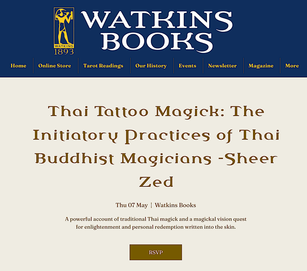 I will be appearing at Watkins Books on the 7th May 2026, 17:00 – 18:00, 19-21 Cecil Ct, London WC2N 4EZ, UK, sharing the details of my profound encounters with Thai magick during my four separate pilgrimages to Thailand which are discussed in my book Thai Tattoo Magick. If you wish to attend this event please RSVP on Watkins Books website.
